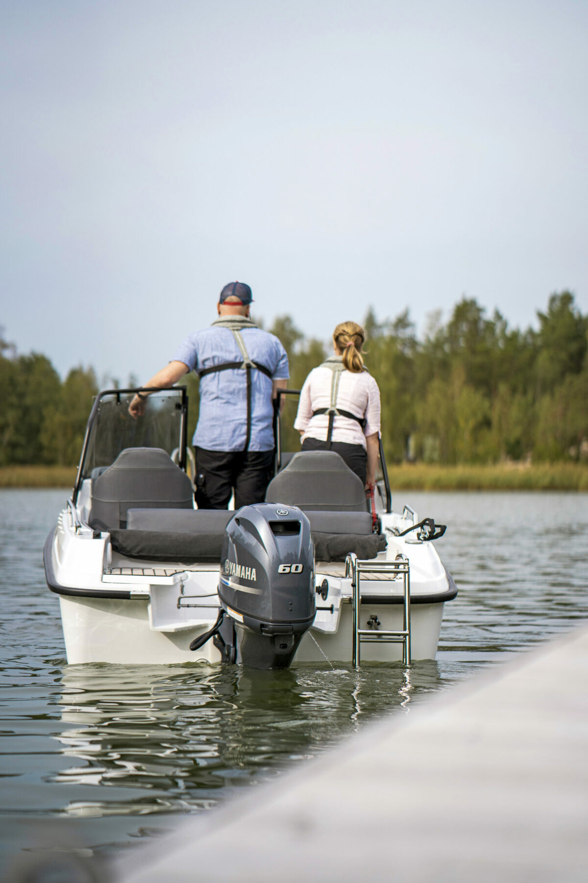 Przestrzeń na pokładzie jest funkcjonalna i bezpieczna: szerokie stopnie ułatwiają poruszanie się po łodzi, a opcjonalna podłoga Softdeck z antypoślizgową powierzchnią zwiększa bezpieczeństwo i estetykę. Czarna owiewka szyby przedniej i solidne relingi dopełniają stylowego wyglądu.