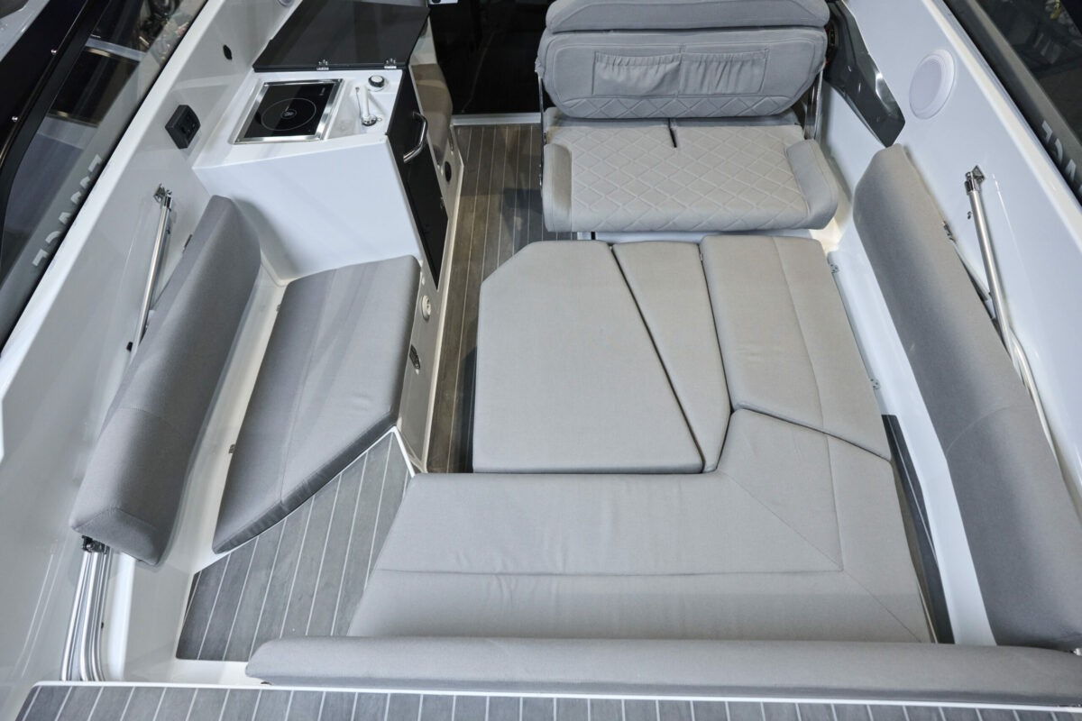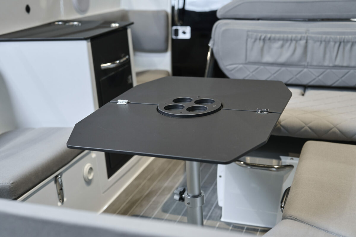 Kurtyny, wycieraczka przedniej szyby, lewa, stół, trym klapy, toaleta wodna ze zbiornikiem septycznym 30 l, lodówka, uchwyt do nart wodnych, Aneks kuchenny z systemem wody pod ciśnieniem system 39 l, Kuchenka, Drabinka dziobowa